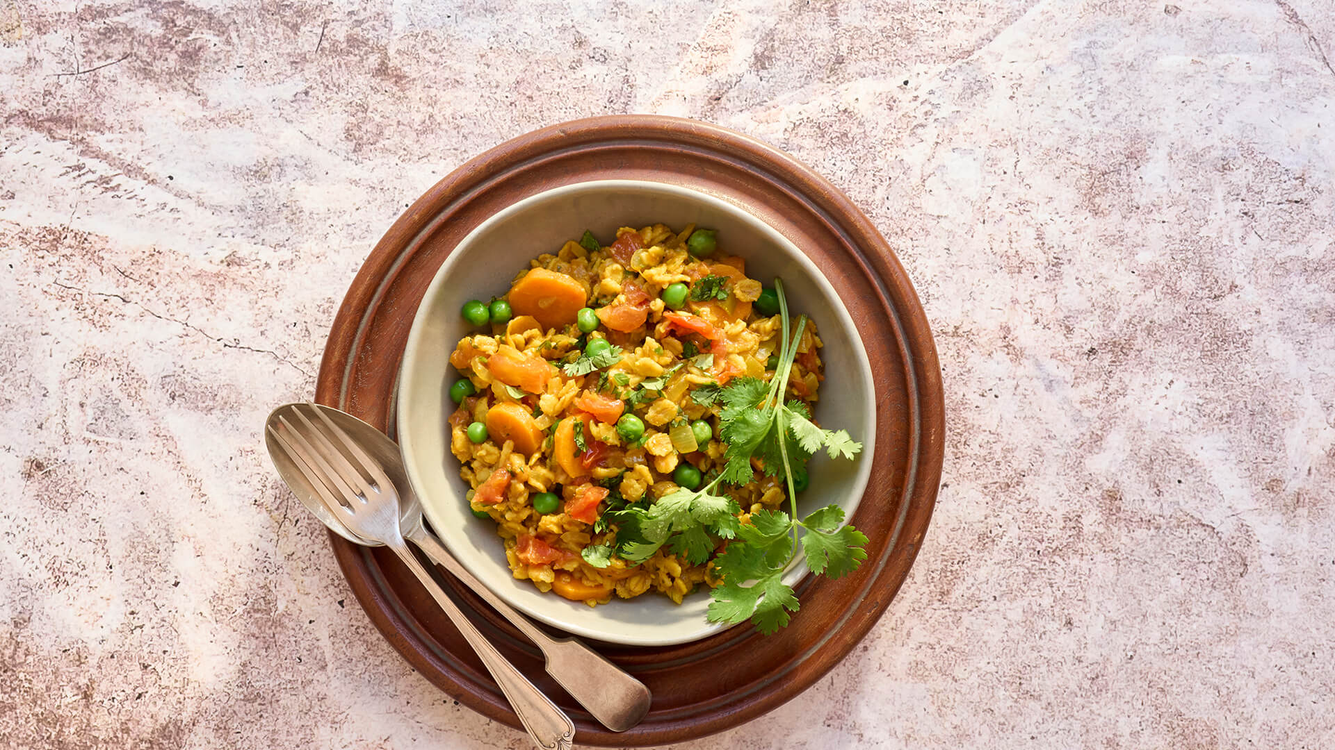 7. Once the oats are cooked, add the peas. Season if necessary and sprinkle with chopped coriander. Serve warm.