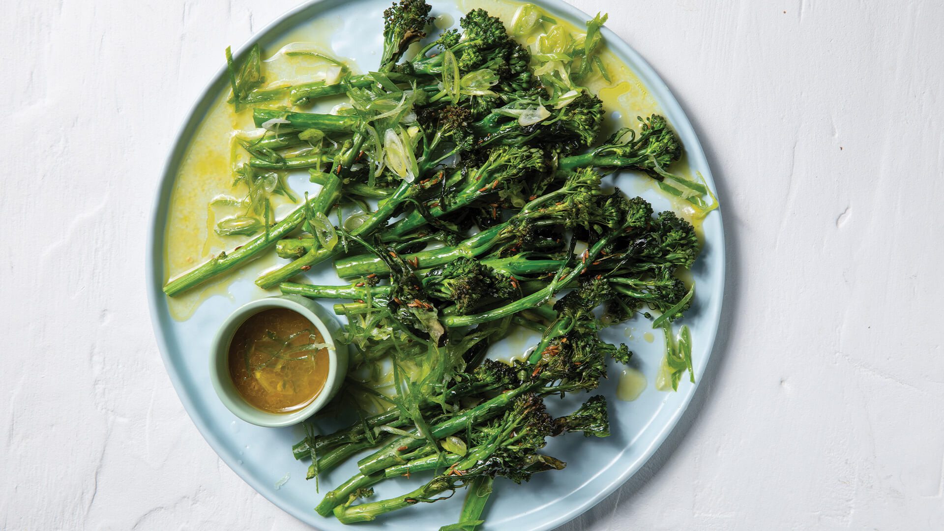 4. Spoon warm broccoli onto a serving platter. Pour sauce over and garnish with spring onions. Serve.