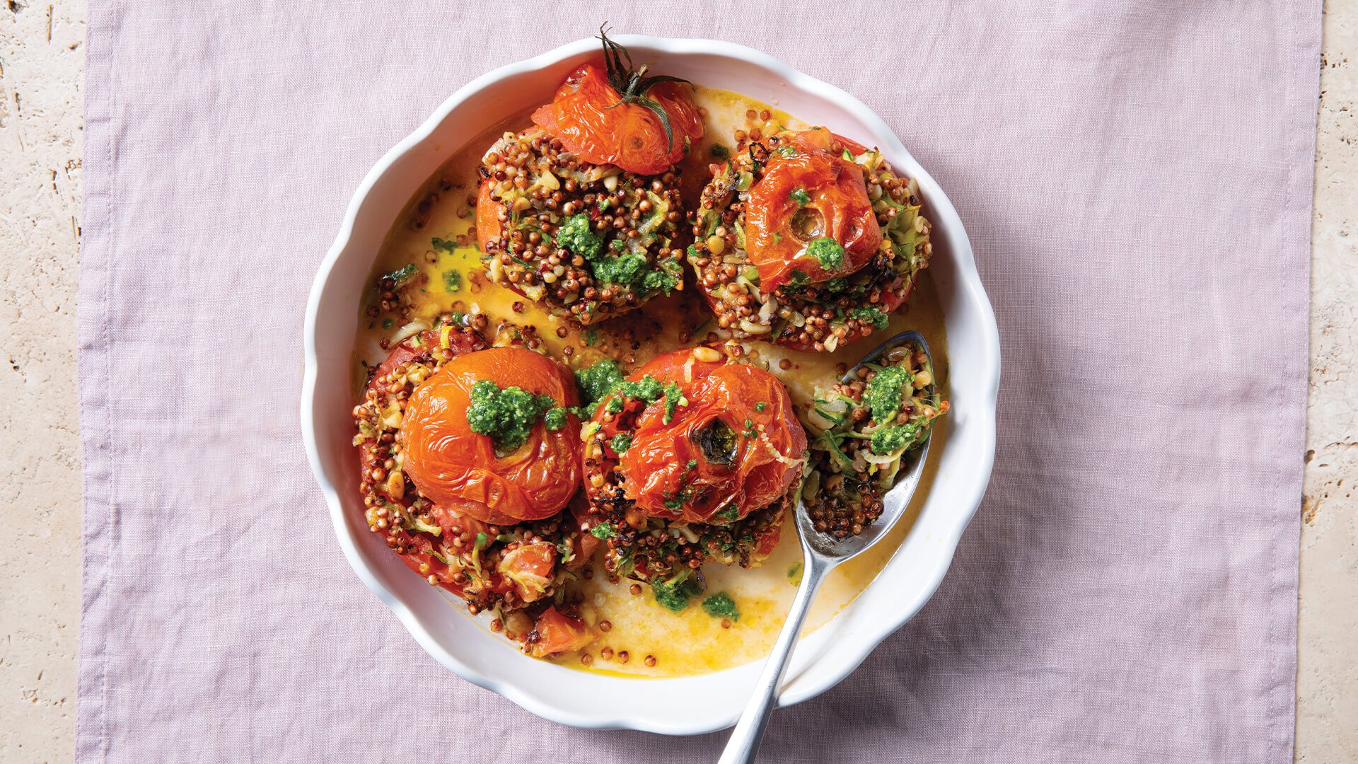 5. Spoon mixture into the tomatoes and top with the reserved tomato tops.