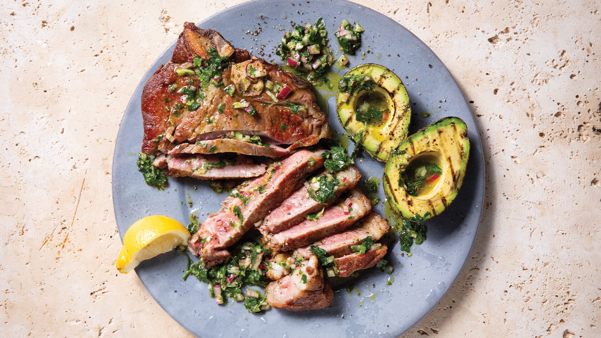 Steak with avocado-chimichurri sauce